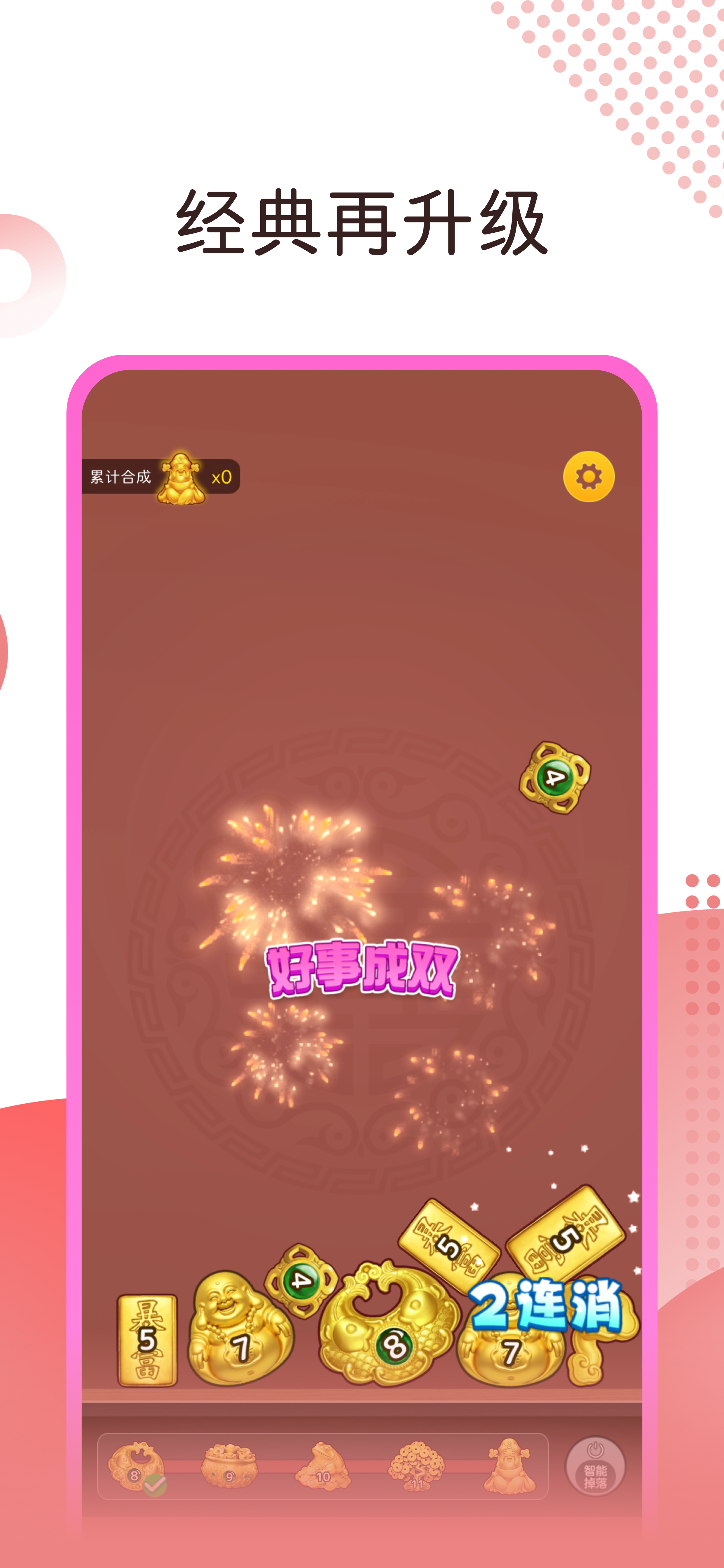 一款将经典数字合成玩法与中国传统财神文化完美结合的休闲益智游戏——《财星高照》! 您对经典的2048游戏一定不陌生,我们保留了其核心的合成乐趣:通过滑动屏幕,让相同的元素两两相合,诞生更高级的元素。但这一次,您合成的不是冰冷的数字,而是充满祥瑞之气的吉祥宝物!从“铜钱”开始:游戏盘面最初会出现最基本的元素——金光闪闪的铜钱。步步高升的合成之路:将两个“铜钱”合成,得到一个“元宝”;两个“元宝”合成,得到一个“钱袋”……您的合成之路,就是一条财富升级之路!终极目标——合成财神爷!当您成功合成出最高级的宝物时,慈眉善目、喜气洋洋的财神爷就会华丽登场!这意味着您已集齐了天地财气,赢得了游戏的胜利!